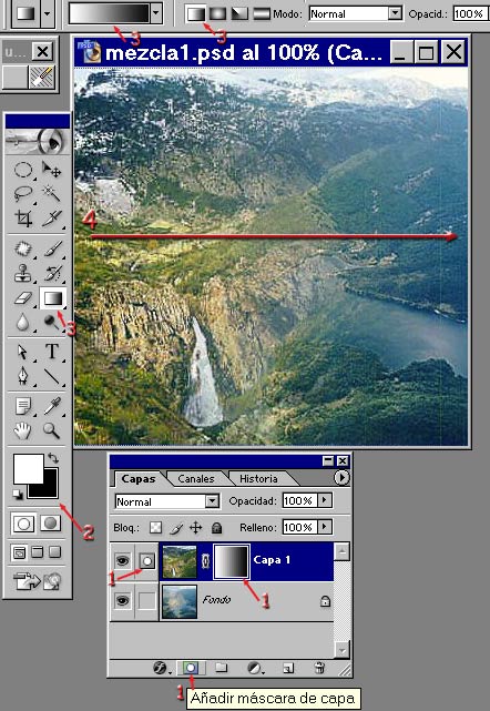 Partimos de la base de que tenemos 2 imágenes en un documento colocadas en 2 capa diferentes. 1) Activamos la Capa superior y picamos el icono inferior en la Paleta Capas que pone "Añadir Máscara de capa" y veremos como se añade un cuadrado blanco al lado de la miniatura de Capa, es la Máscara de Capa. 2) Selector de Color: frontal blanco, fondo negro (Teclas "D" y "X") 3) Para destapar un lado suavemente y dejar ver la imagen situada en la capa inferior hay que rellenar la Máscara con un degradado de blanco a negro por lo que elegimos la herramienta Degradado Lineal. Blanco tapa, negro destapa (se puede configurar para que sea al contrario) 4) Trazamos un degradado en la Máscara de izquierda a